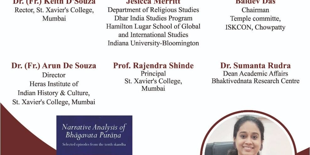 Book ‘Narrative Analysis of Bhāgavata Purāṇa’. The book will be inaugurated at the hands of Baldev Das (Vice President, ISKON temple), Jesicca Merritt (Indiana University-Bloomington), Keith D’souza (Rector, St. Xavier’s College), Dr. Fr. Arun Desouza, (Director, Heras Institute of Indian Culture, St. Xavier’s College), Prof. Rajendra Shinde (Principal, St. Xavier’s College), Dr. Sumanta Rudra (Dean Academic Affairs, Bhaktivedanta Research Centre)