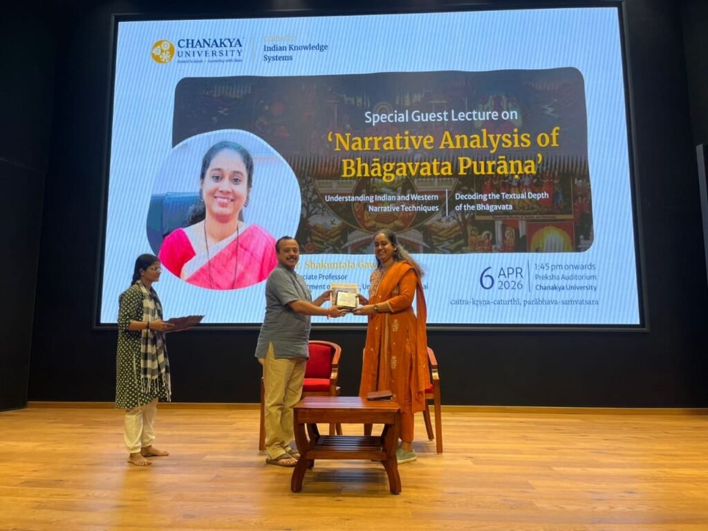 Dr. Shakuntala Gawde was invited to deliver a special guest lecture on “Narrative Analysis of Bhagavata Purana” at the IKS Centre, Chanakya University, Bangalore. In her lecture, she explored the vast landscape of Indian narrative literature, encompassing diverse genres such as myths, legends, fables, poetry, history, as well as performing and visual arts like music, dance, and painting.
